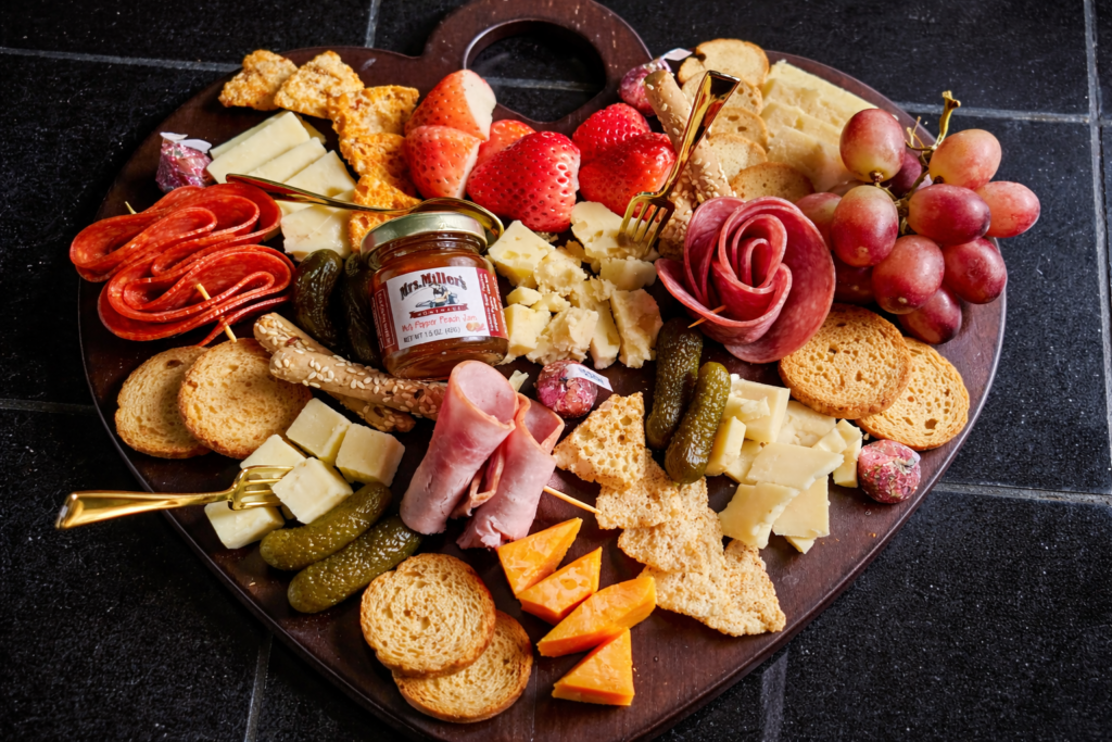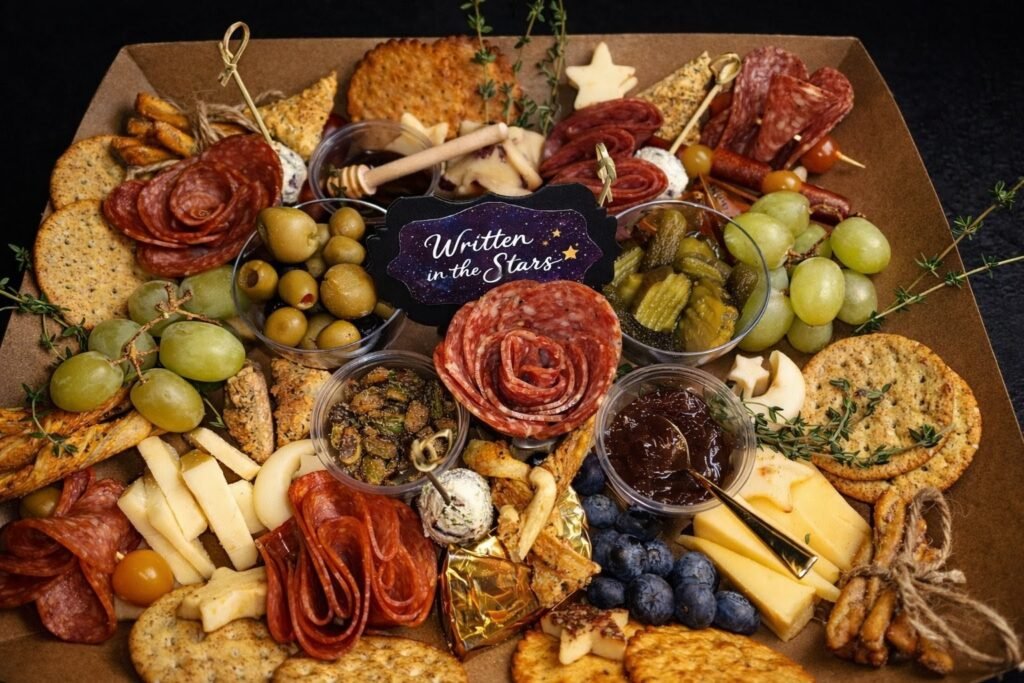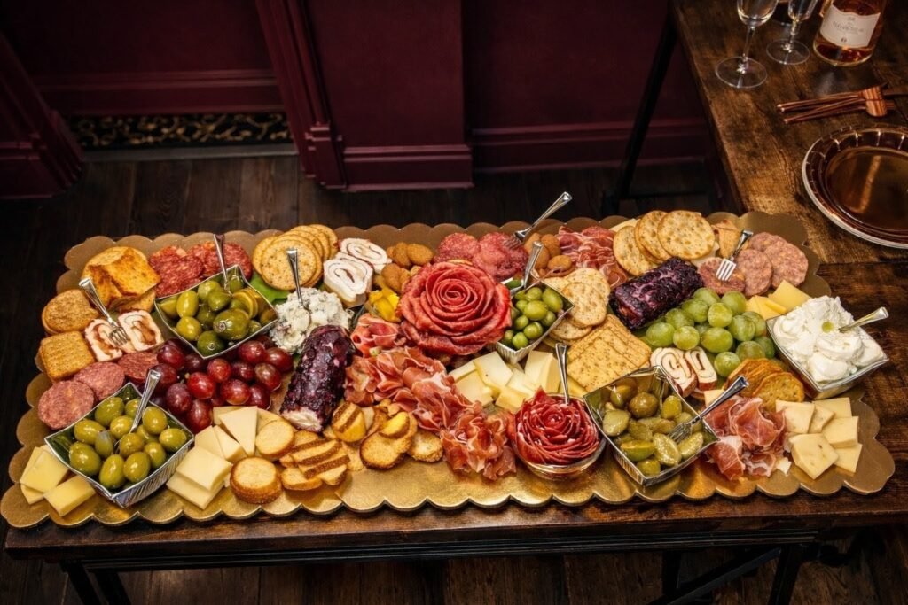 An artfully arranged assortment of premium cheeses, charcuterie, seasonal produce, nuts, olives, and gourmet additions.